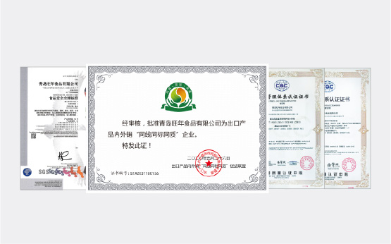 旺年堅(jiān)持以食品安全作為發(fā)展的基石,除通過ISO9001、ISO14001、ISO45001、HACCP等體系認(rèn)證外,還成為了業(yè)內(nèi)為數(shù)不多具備出口食品生產(chǎn)企業(yè)資質(zhì)、通過英國零售商協(xié)會(BRC)頒發(fā)的全球食品安全標(biāo)準(zhǔn)A級認(rèn)證并獲得出口產(chǎn)品內(nèi)外銷“三同”證書的企業(yè)之一,產(chǎn)品出口美國、加拿大等多個(gè)國家和地區(qū)。
